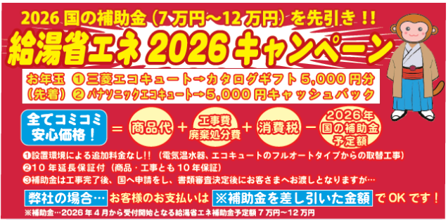 「給湯省エネ2026事業」とは、高効率給湯器の導入費用の一部を国が補助する制度です。