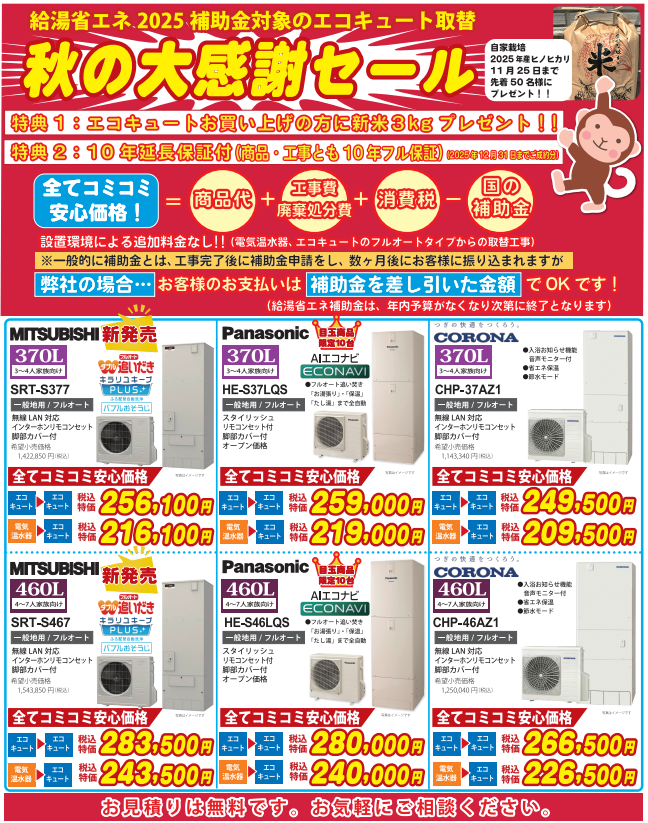 秋の大感謝セールとしてエコキュートご成約の方に特典を2つご用意しました。